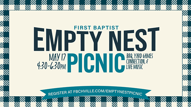 The Empty Nest Ministry is hosting a kickoff picnic at the Farm! Join other empty nesters in bbq, games, entertainment, and fellowship with others in the same life stage. Bring your Connect Group or come and meet others. Register for free here.
